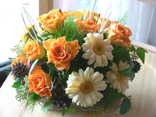 つやつや、プリプリの元気なマリークレアをメインに明るいお祝いアレンジを。。。