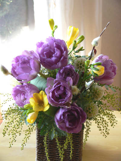 ベテラン女性のイメージでチョッとシックな色合いのチューリップをメインにしました。