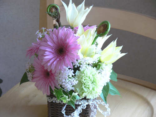 ガーベラやチューリップを使ってかわいらしくと言うご希望で。