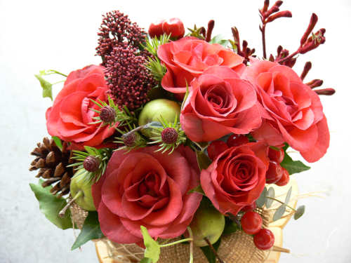 渋めの色のバラと実ものをたっぷり使って秋らしいアレンジを。