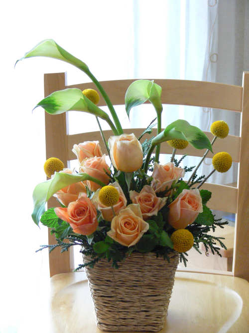 オレンジ色のバラで明るさを、グリーンのカラーやたっぷりのグリーンで爽やかさを、ゴールデンスティックで可愛らしさを出してみました。