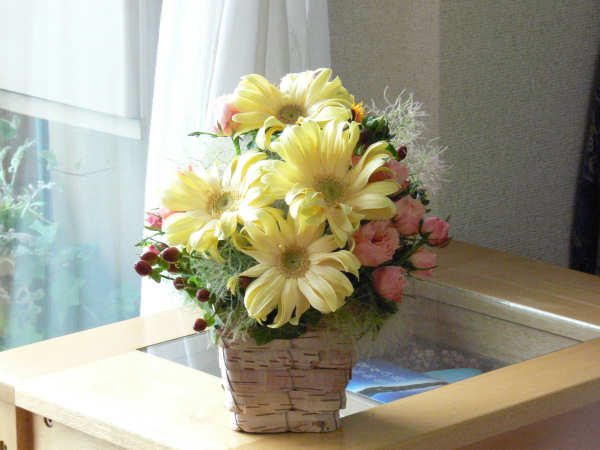職場では花束をお贈りし、別の場所でアレンジをお渡しするとのことだったので、メインのお花を変えてアレンジしました。