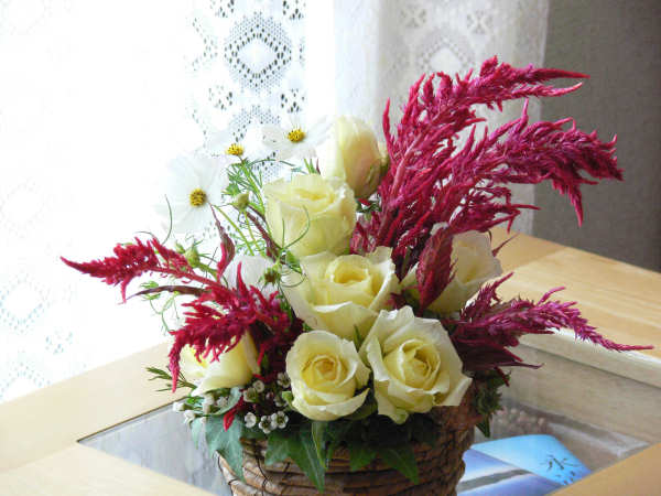 ケイトウやコスモスで秋らしさもプラスしてみました。
