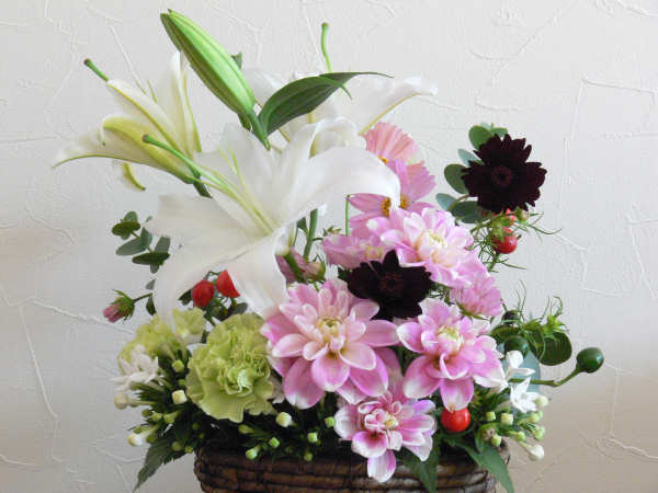 ブログをご覧になってダリアやコスモスを入れたアレンジをとご注文いただきました。