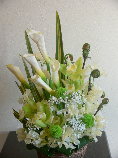 白とグリーンで仏花っぽくならないようにとのご希望です。