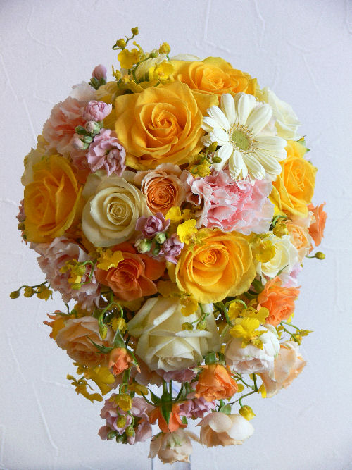ドレスが豪華なので柔らかいながらもドレスに負けないようにオーバルでお花たっぷりな感じを出そうと思いました。