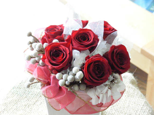 還暦なので赤いバラを中心にというご希望でお作りしました。