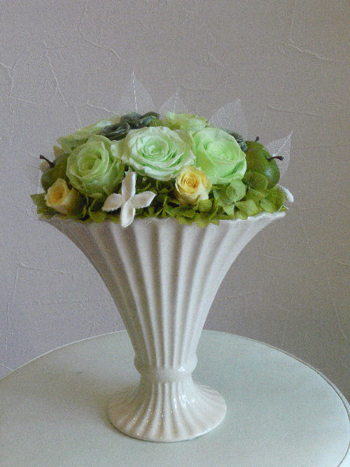 お花の前にも小物を置くので、高さのある器にアレンジしました。