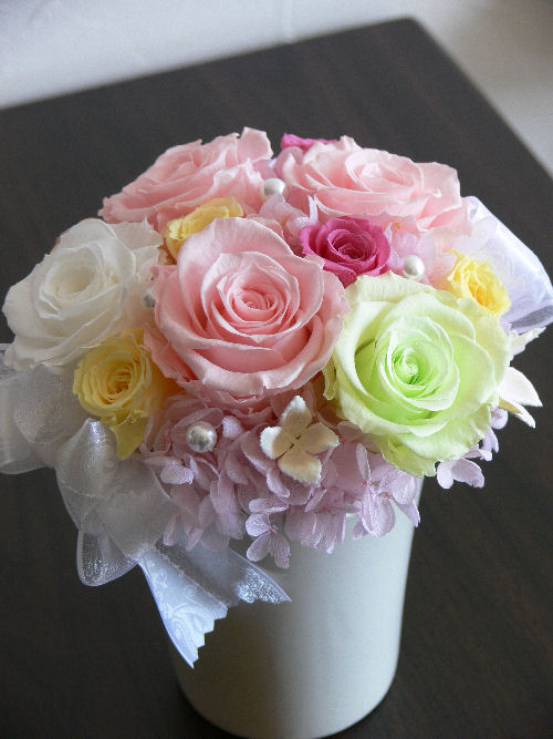 もう何度もプリザアレンジをお届けしているお客さまなので、これまでのものと重ならないように気をつけて。。。