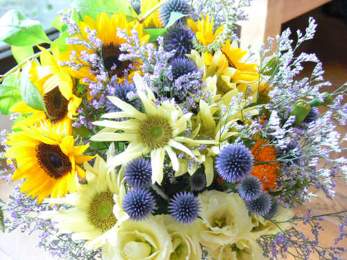 ラウンドタイプの花束。ヒマワリが入っているので結構大きめです。